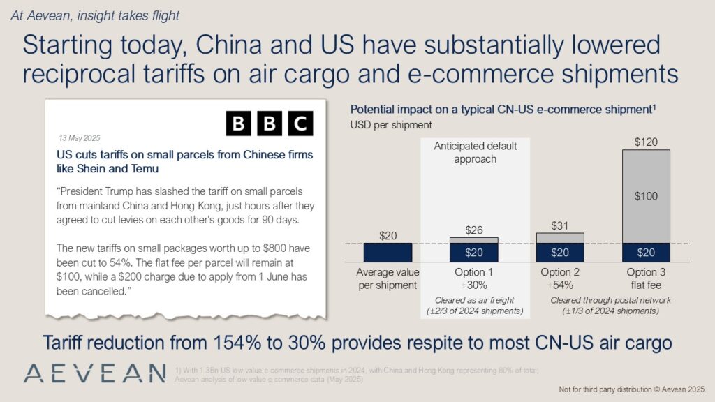 Ecommerce cleared under the de-minimis exemption is anticipated to be cleared as air freight (at 30%, +$6 per shipment) by default, instead of utilizing the postal network (+$11-100 per shipment).