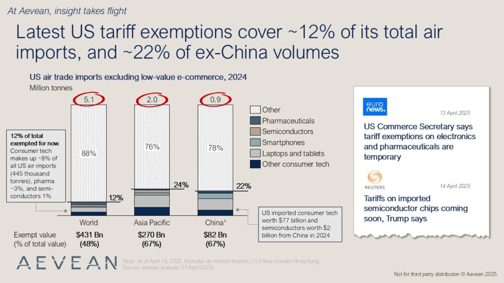 In this very dynamic situation, the latest round of (temporary) tariff exemptions on consumer tech and semiconductors mainly affect US air imports from Asia Pacific (24% in tonnes, 67% in value), and China-US (22% in tonnes, 67% in value).