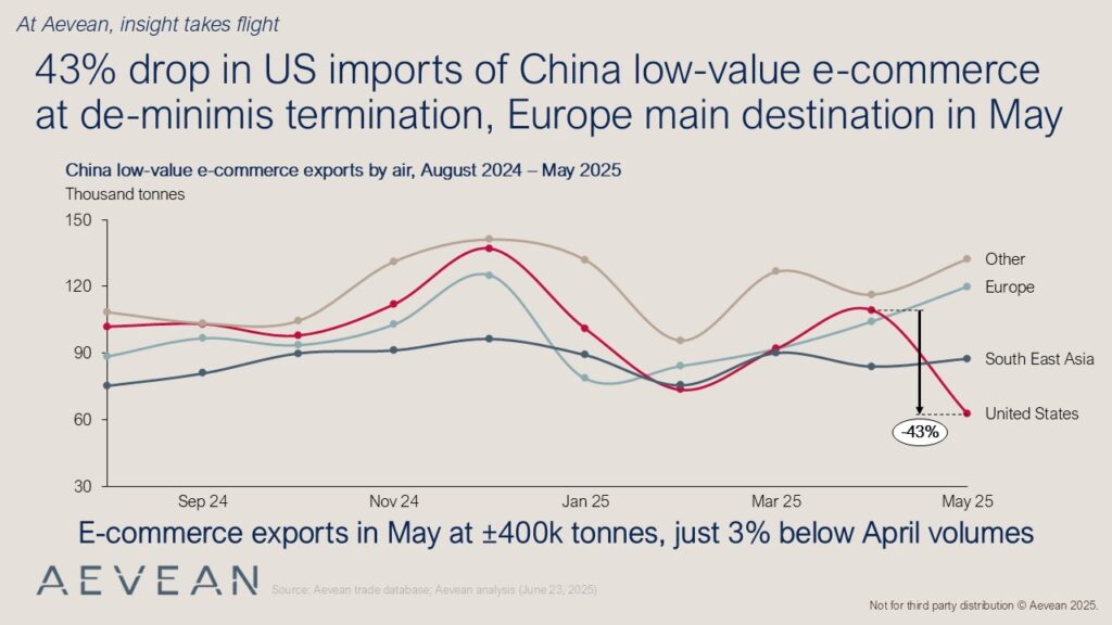 📉 A steep 43% drop in low-value e-commerce shipments from China to the US in May, driven by the termination of de minimis exemptions.