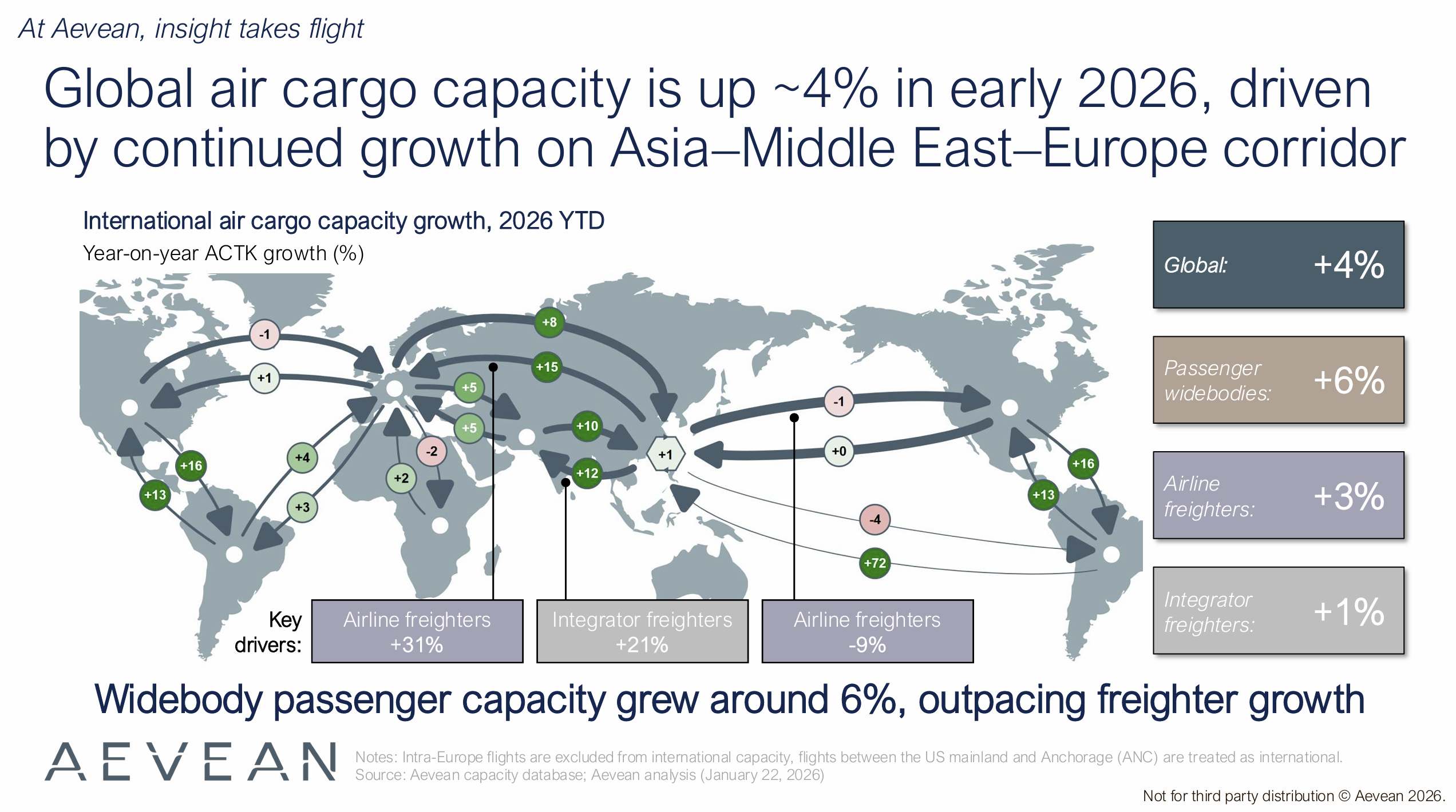 Global air cargo capacity is up ~4% in early 2026, driven by continued growth on Asia–Middle East–Europe corridor