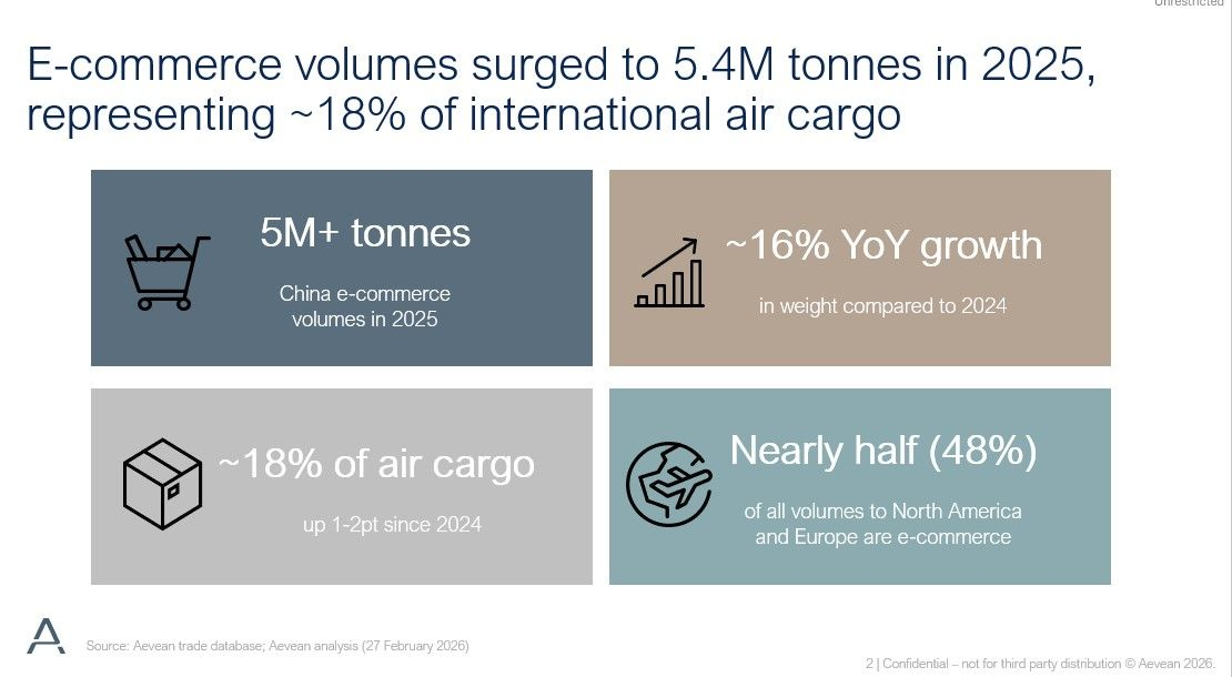 E-commerce volumes surged to 5.4M tonnes in 2025, representing ~18% of international air cargo