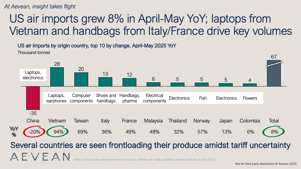 In April-May 2025, US air imports grew 8% YoY. It’s a story of frontloading and trade shifts of laptops, electronics, handbags, fish, and more: