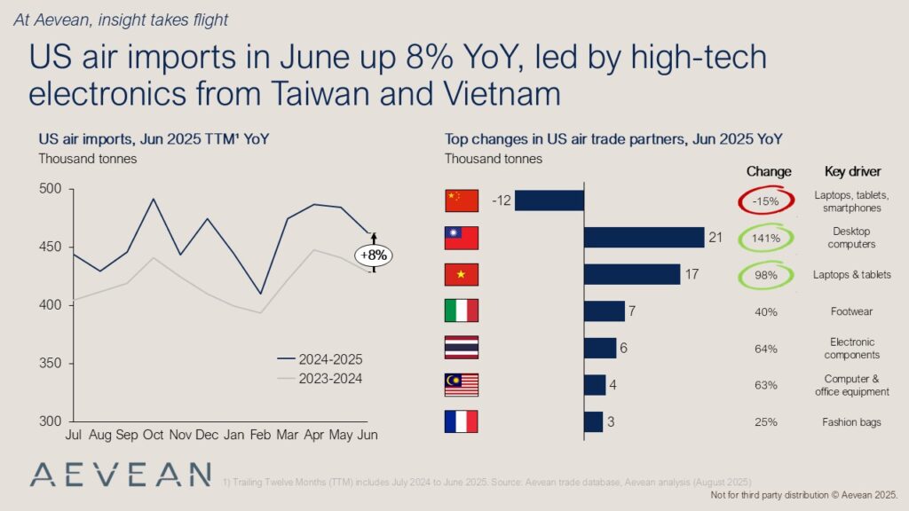 📈 US air imports rose 8% YoY in June 2025, with gains from Taiwan and Vietnam more than offsetting the drop from China