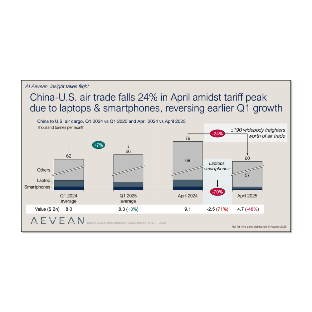 Read moreChina-US air cargo declines by ±10k tonnes in April 2025 vs last year, an equivalent of ±100 widebody freighters, driven by a 50%+ drop in laptops & s...